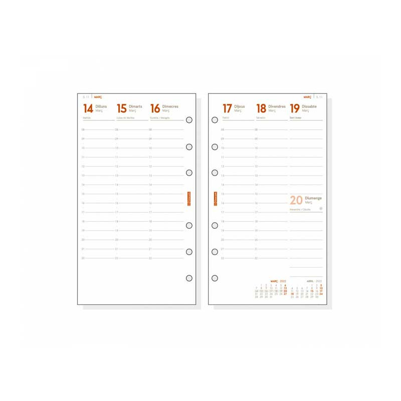 - Agenda de espiral - Cubierta de poliuretano - Semana vista - Uñero microperforaado - Goma elástica - Bloc de notas independiente